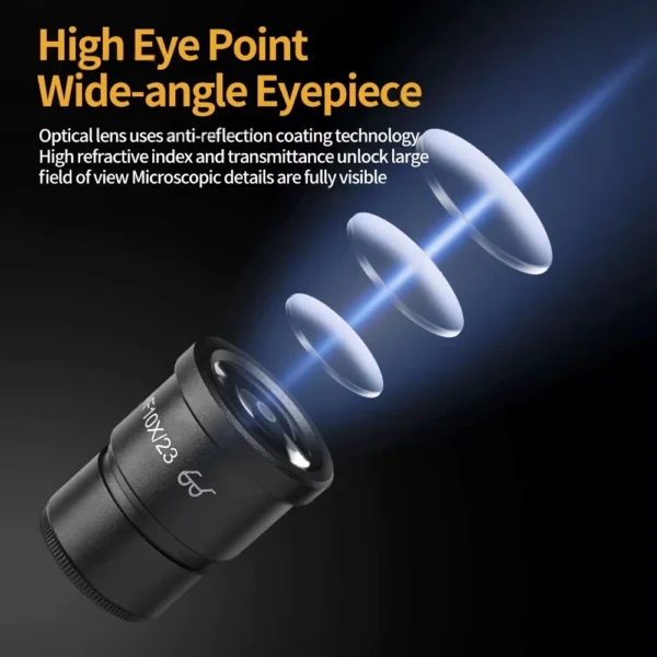 • Optical lens uses anti-reflection coating technology, high refractive index and transmittance, unlock large field of view, microscopic details are fully visible